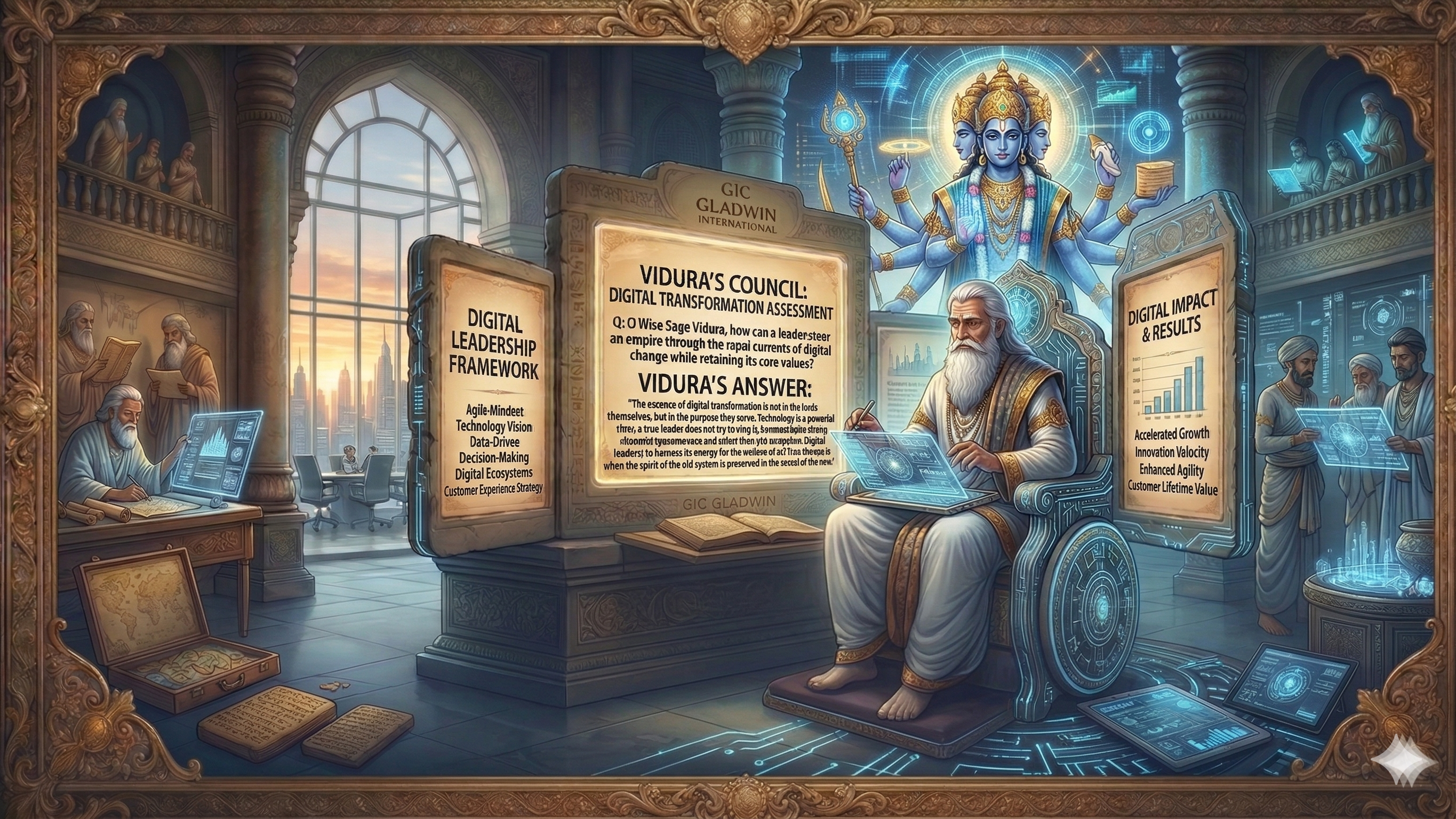 Narada never stopped moving. He could not stop — because the moment he stopped, the worlds would lose their connection to each other, and each world would slowly calcify into the assumption that its current reality was the only reality possible. The great digital transformation leader carries the same urgency: the organisation that stops receiving the intelligence of what is already happening in the world around it begins, immediately, to mistake its current capabilities for sufficient ones. The transformation leader's job is never finished — because the world never stops changing, and the intelligence of what is already real in the world always needs a Narada to carry it inside. That is the Digital Transformation leader Gladwin International will find for you: the one who plays the vina before they present the strategy, who carries the intelligence that makes the status quo untenable, and who builds the organisation's capacity to transform not once but continuously — because in the world Narada inhabits, the only stable state is motion.
